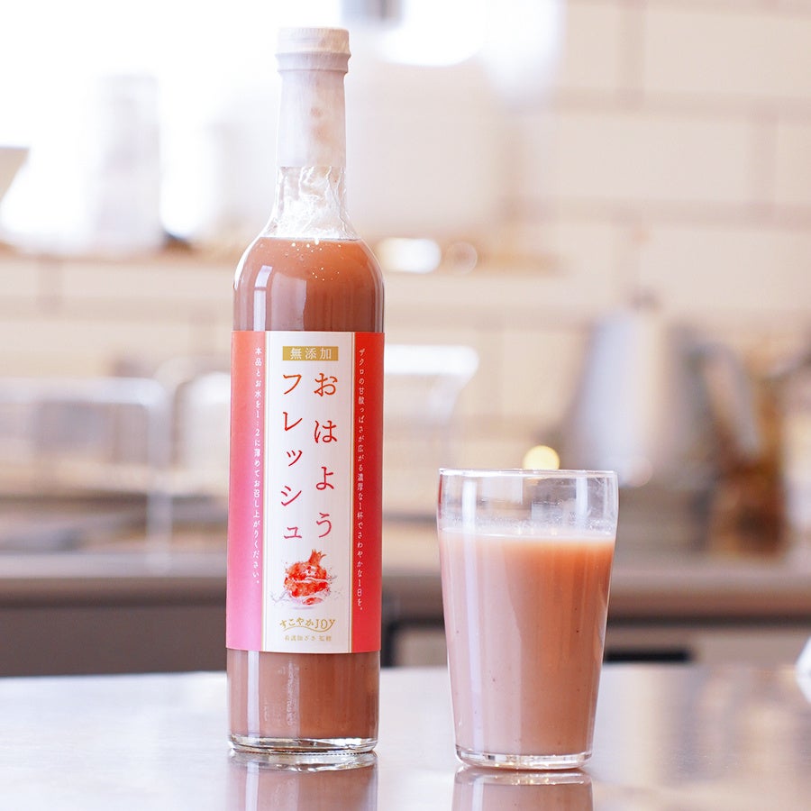 水と「おはようフレッシュ」を2:1の目安で希釈してドリンクとして飲むだけでなく、食パンにジャムの代わりとして塗ったり、アイスクリームにフルーツソースの代わりにかけて美味しく手軽にお召し上がりいただけるのも「おはようフレッシュ」の魅力です。