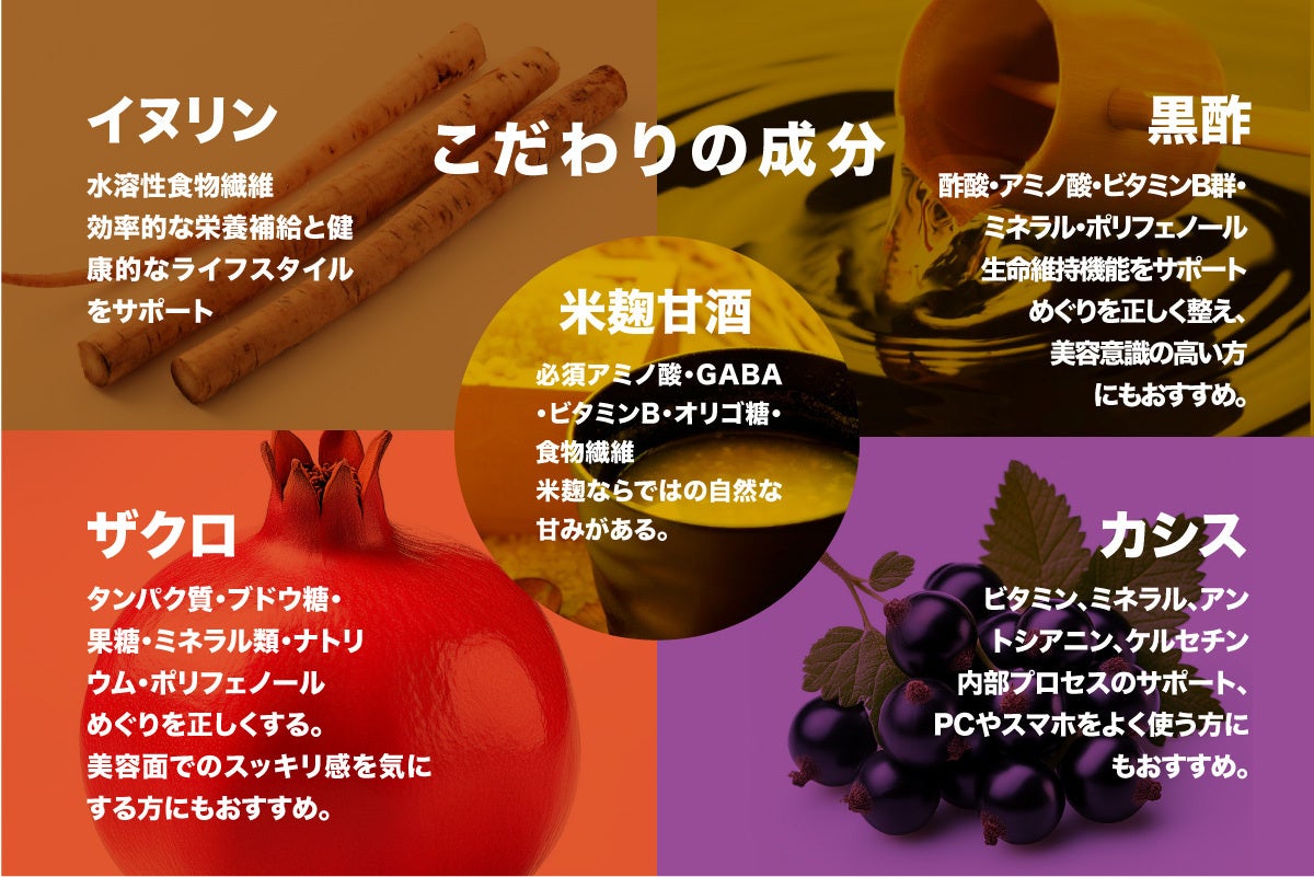 視聴者より人気が高い食品ではあるものの、添加物の懸念、味の好みや種類が多いためなかなか生活に取り入れづらいという悩みに寄り添い、甘酒と黒酢の独特な風味をマイルドにさせるざくろ果汁をミックスし、フルーツミックスジュースのような味わいに仕上げました。