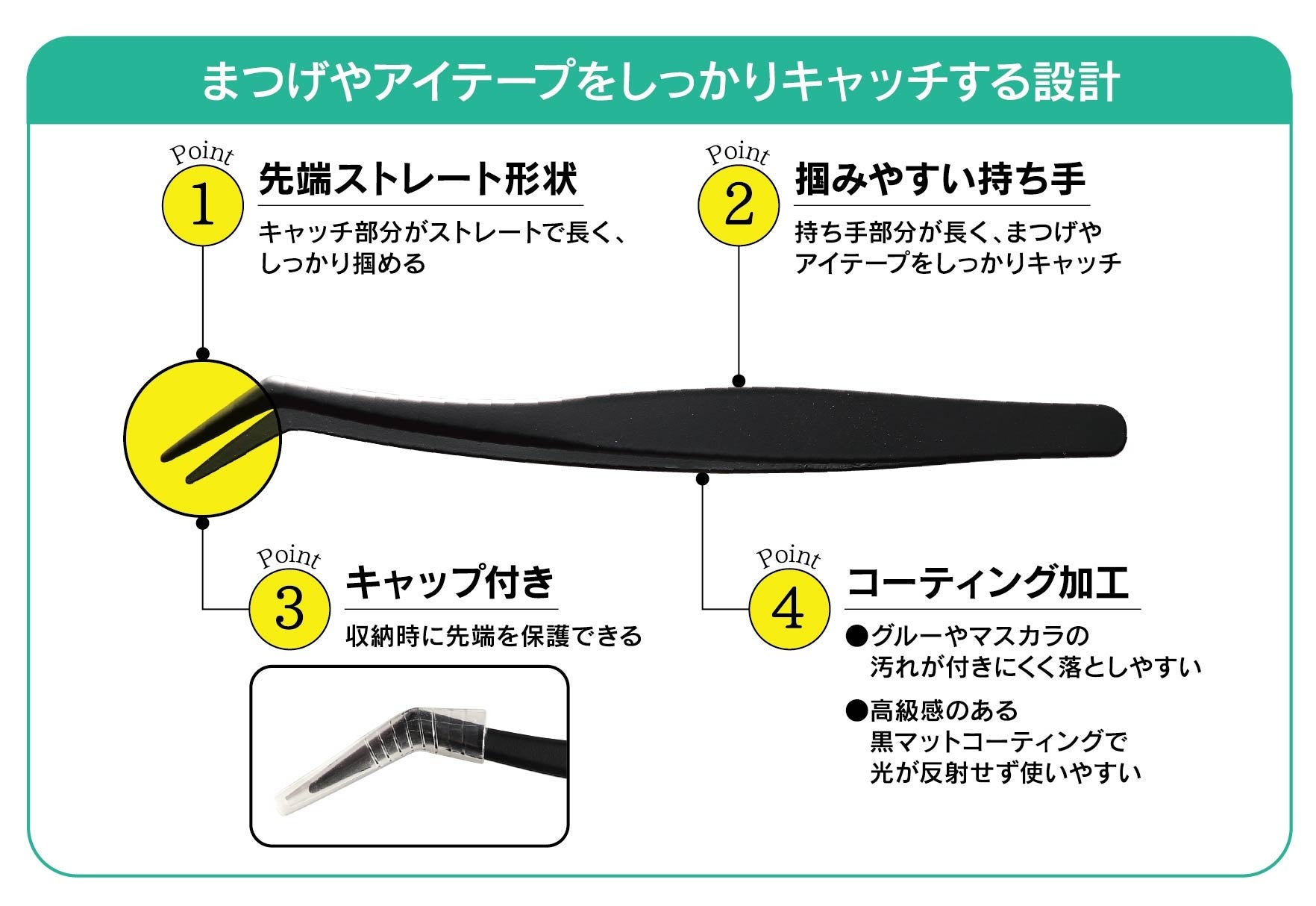 先端ストレート形状で、まつげやアイテープを掴みやすい、アイメイク用ツィザーズ。持ち手部分が長く、安定した使い心地。マットコーティングでグルーやマスカラの汚れが付きにくく落としやすい。束感のあるまつげの仕上げや、つけまつげの着脱等に便利。