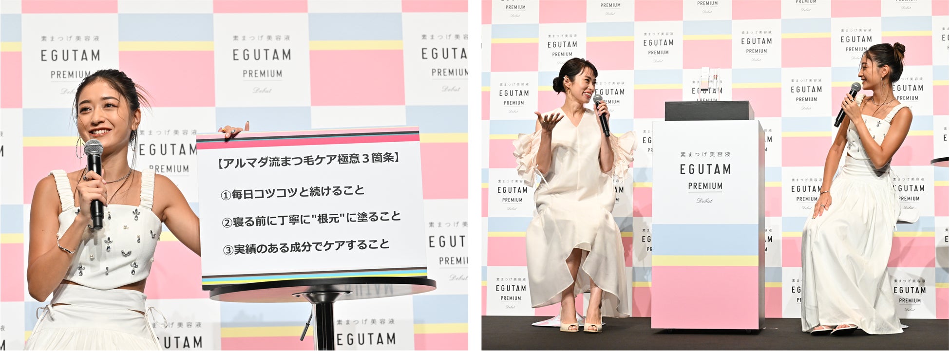 具体的にどのような選び方をしたらいいかの質問に対し岡本さんは「『エクソソーム』という成分についてご存知でしょうか。美容業界でも注目されている成分であり、まつげケアに適した成分なんです。こういった成分が高濃度で含まれる商品に注目すると良いと思います。」とアドバイスしました。これに対し、みちょぱさんは「こうやってお話をしていて、まさしくエグータムプレミアムが自分にもぴったりだと感じました。いま使用しているものも使い切って、エグータム1日アンバサダーとして周囲にも伝えていきたい。」と意気込みを語りました。