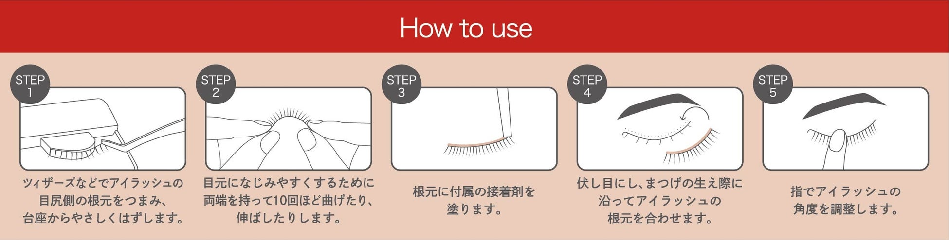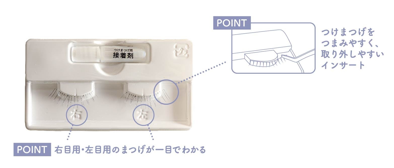 つけまつげの台紙に、左右が一目で分かるよう記載があります。また、つけまつげを台紙から取り外しやすいように、つけまつげを留めている土台をつけまつげより一回り小さくしています。初めての方でも使いやすい工夫です。
