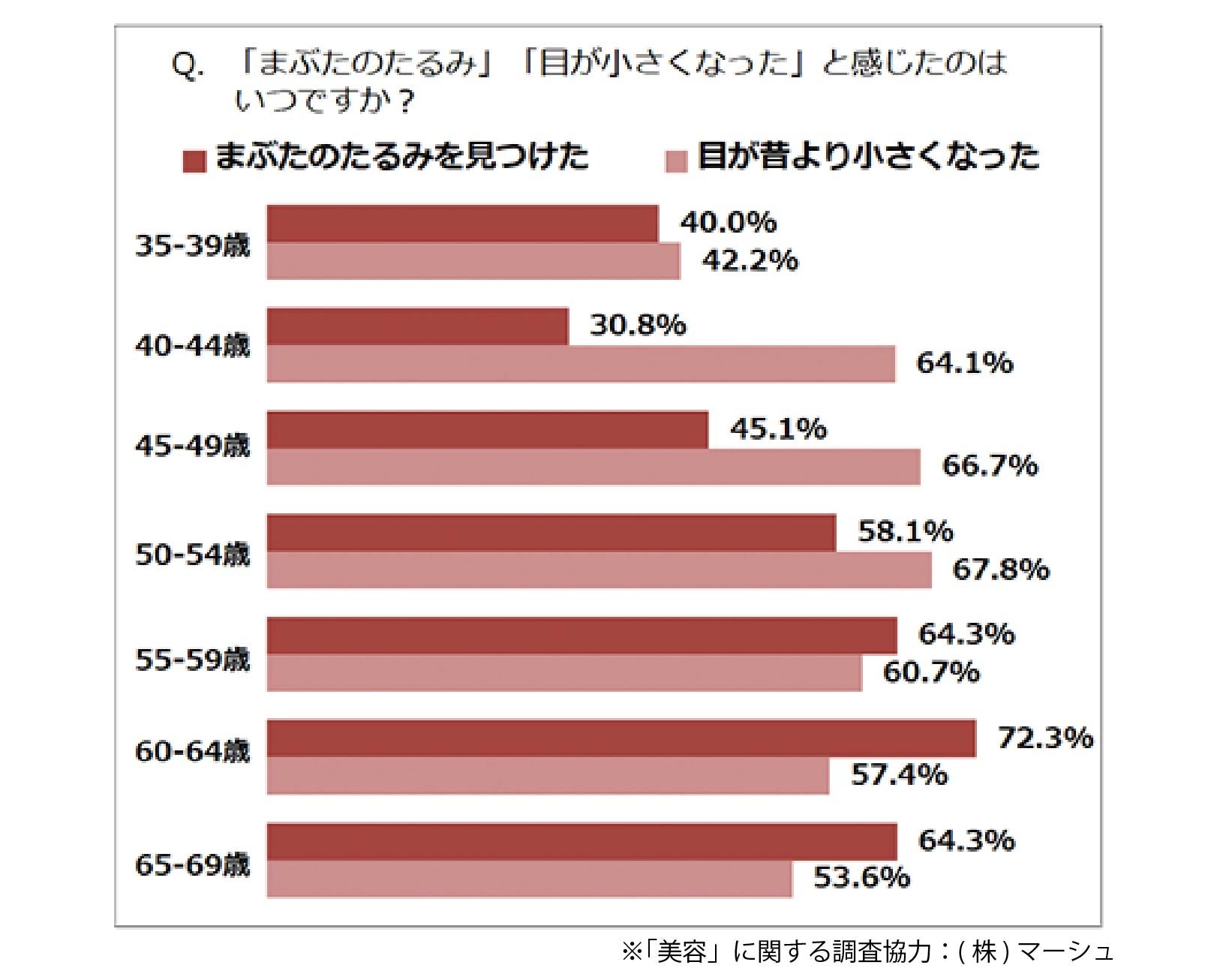 目や目元に悩みのある人のうち、「目が小さくなった」と感じる人は35~39歳では42.2%、40~44歳では64.1%と急激に上がっています。20~30代ではすっきりとした印象だった目元に40代以降変化を感じて戸惑う方も多いようです。自由回答では他人から「疲れて見える」「目がたれている」などと言われたというエピソードもあり、周囲に分かるほどの変化であることも。第一印象を大きく決めるとも言われる「目元」の老化は悩ましいものと考えられます。