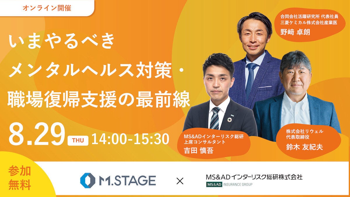 株式会社エムステージ(本社:東京都品川区、代表取締役:杉田雄二)の産業保健事業部は、8/29(木水)14時より、MS&ADインターリスク総研株式会社と、メンタルヘルス対策について解説するウェビナーを共同開催いたします。