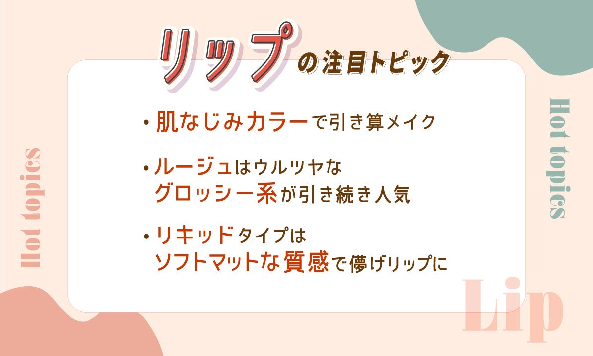 アンダーアイチークがブームの兆しとなっており、チークがメイクのポイントとなる傾向のためか、リップは主張しすぎず肌なじみの良いカラーで仕上げる事がポイントとなりそう。