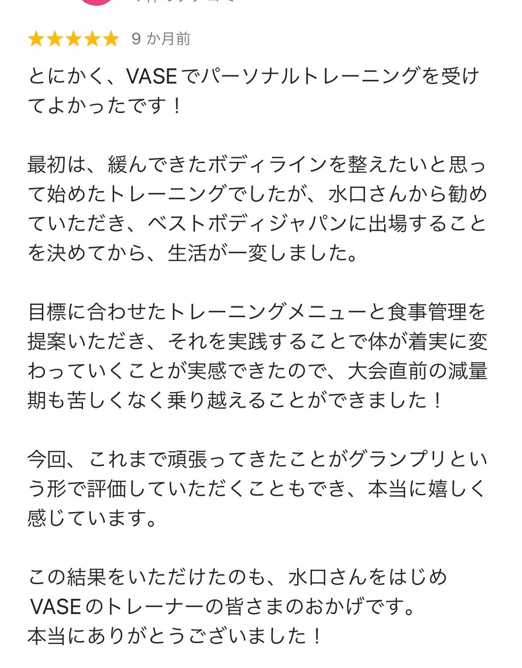 この結果をいただけたのも、水口さんをはじめVASEのトレーナーの皆さまのおかげです。