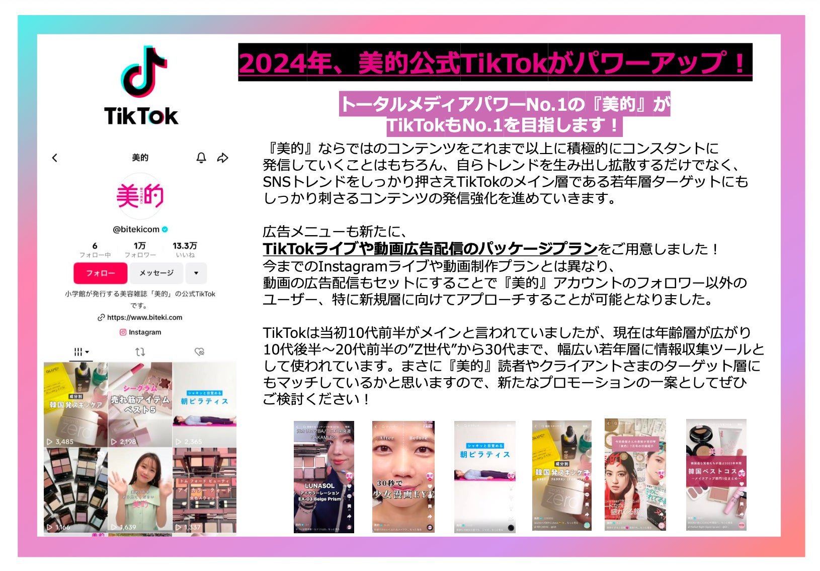 小学館が運営をする『美的』は、トータルメディアパワー 美容誌No.1の美容メディアです。『美的』ならではのコンテンツをこれまで以上に積極的にコンスタントに発信していくことはもちろん、自らトレンドを生み出し拡散するだけでなく、 SNSトレンドをしっかり押さえTikTokのメイン層である若年層ターゲットにも しっかり刺さるコンテンツの発信強化を進めていきます。