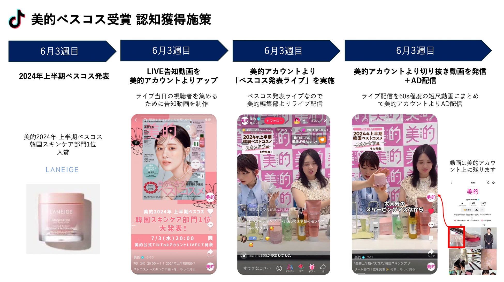 ブランド:LANEIGE2024年上半期ベスコス受賞をフックに、美的編集部によるLIVE配信とLIVE切り抜き動画の配信を行いました。