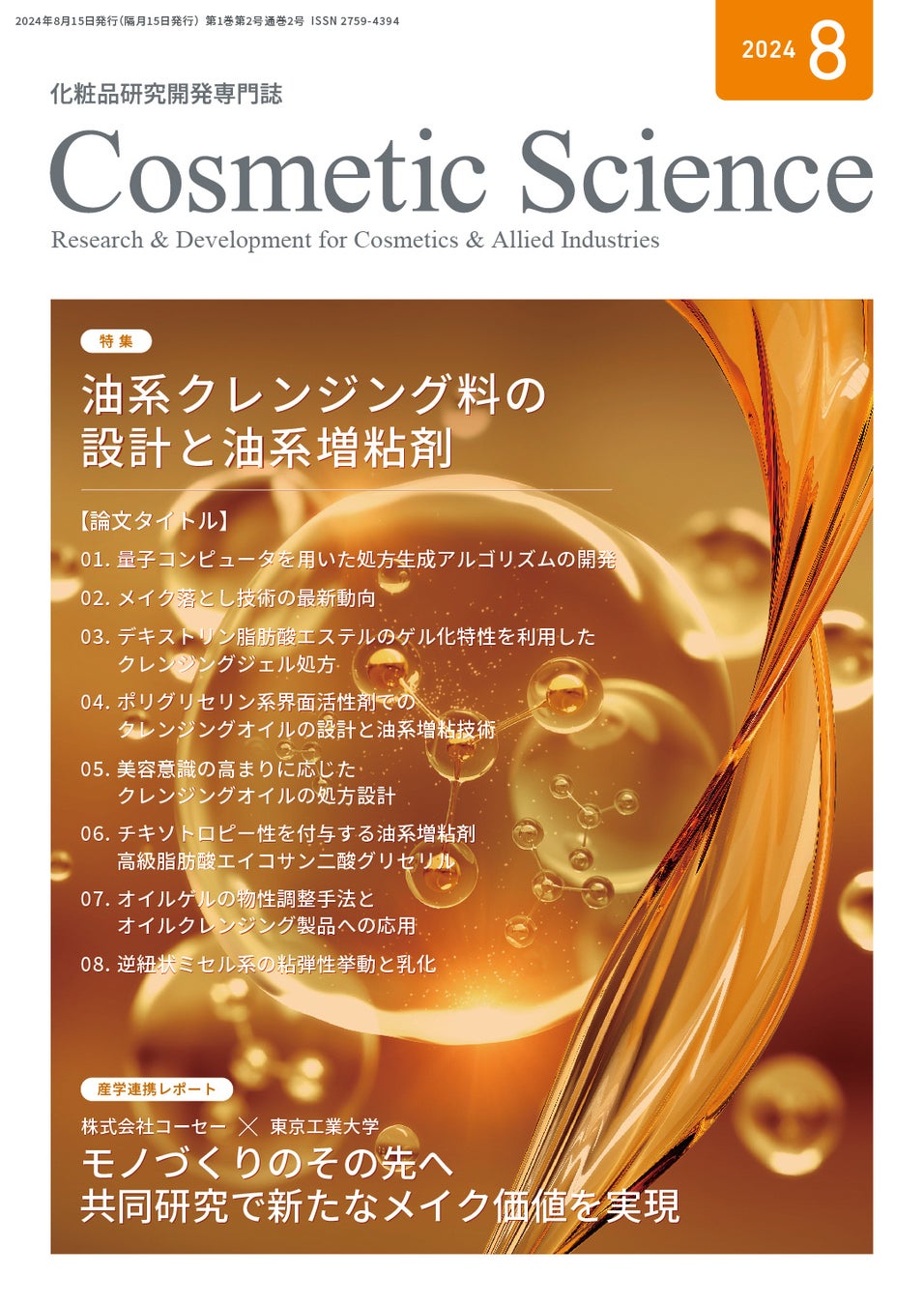 本号の特集は「油系クレンジング料の設計と油系増粘剤」と題し、以下の論文を掲載しております。