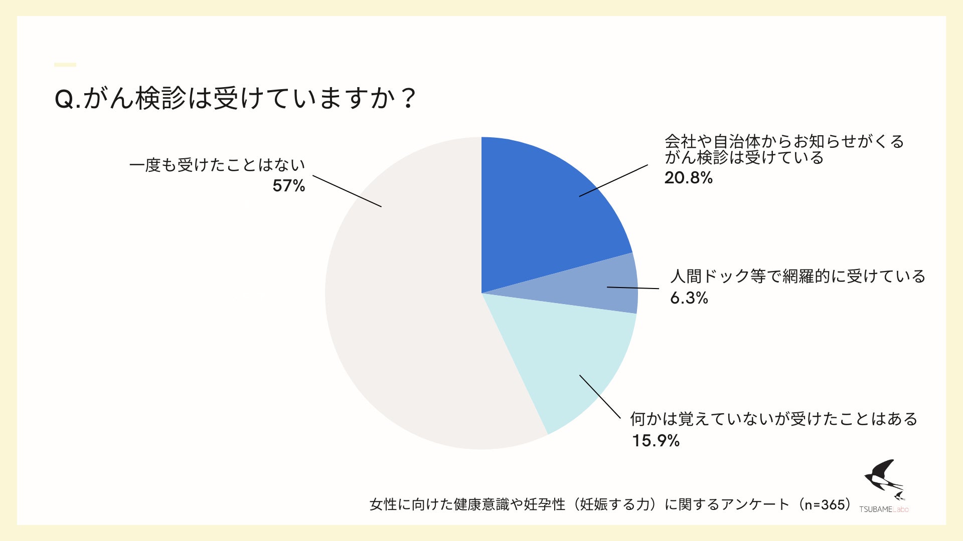 ・がん検診については、「会社や自治体からお知らせがくるがん検診は受けている」が20.8%、「人間ドック等で網羅的に受けている」が6.3%であるのに対し、「一度も受けたことはない」は57%にも及びます。女性特有の癌は好発年齢が比較的若い世代であり、今回のアンケート対象の世代と重なる世代です。