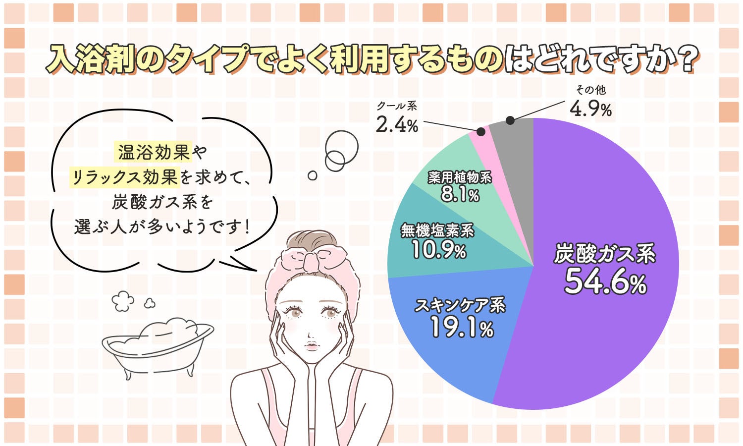最もよく利用されている入浴剤のタイプは「炭酸ガス系」であり、全体の54.6%を占めています。炭酸ガス系の入浴剤は、温浴効果やリラックス効果が高いものが多く、ユーザーに支持されていることがわかります。次いで「スキンケア系」が19.1%、「無機塩素系」が10.9%と続いており、これらのタイプも一定の人気を集めています。「薬用植物系」や「クール系」も利用されており、季節や目的に応じて使い分けられていることが示唆されます。