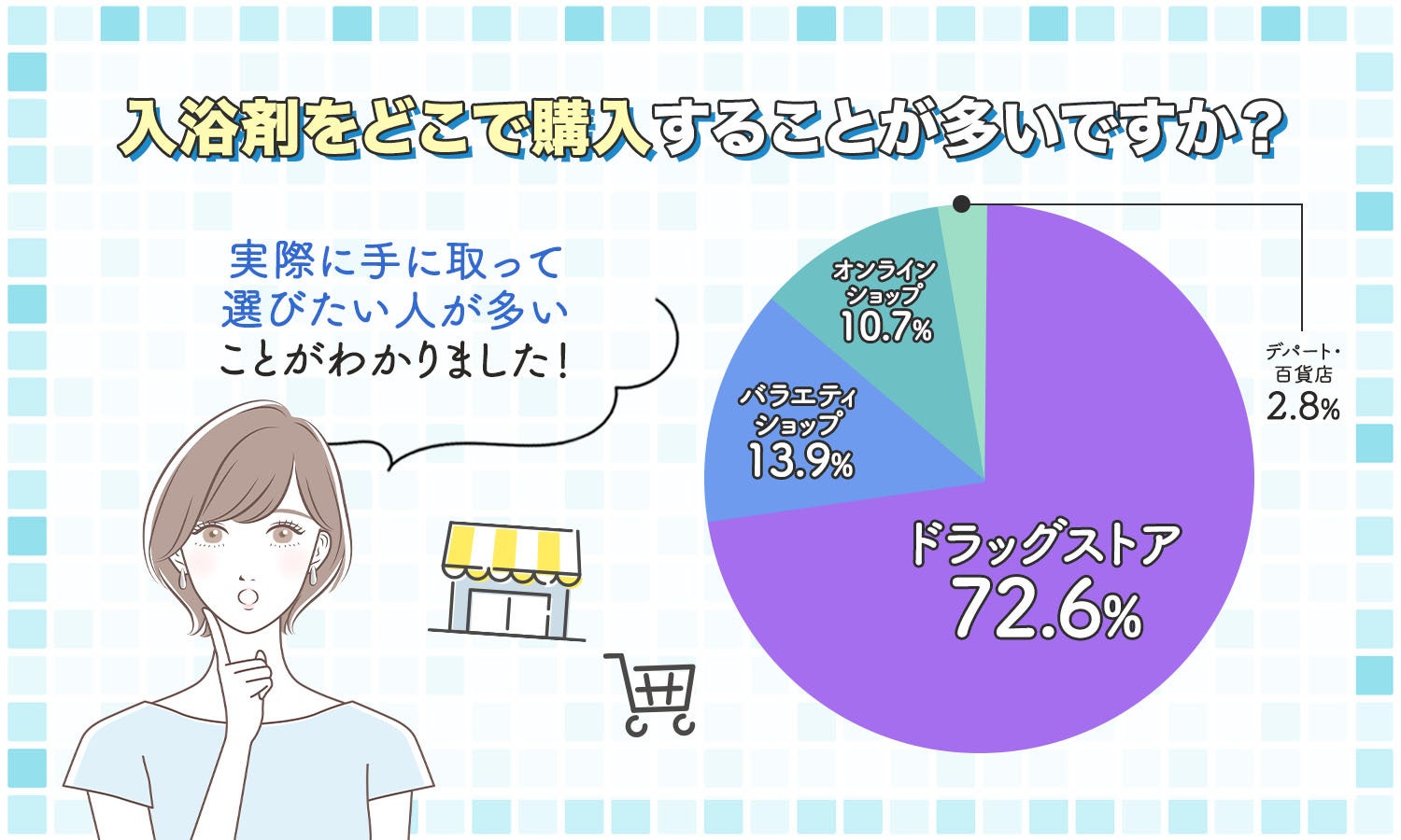 アンケート結果から、入浴剤を購入する場所として最も多いのは「ドラッグストア」であり、全体の72.6%を占めています。身近なドラッグストアで購入する層が大部分を占めています。次いで「バラエティショップ」が13.9%、「オンラインショップ」が10.7%と続いており、こだわりの商品や独自の商品を選びたい層が利用していることが伺えます。