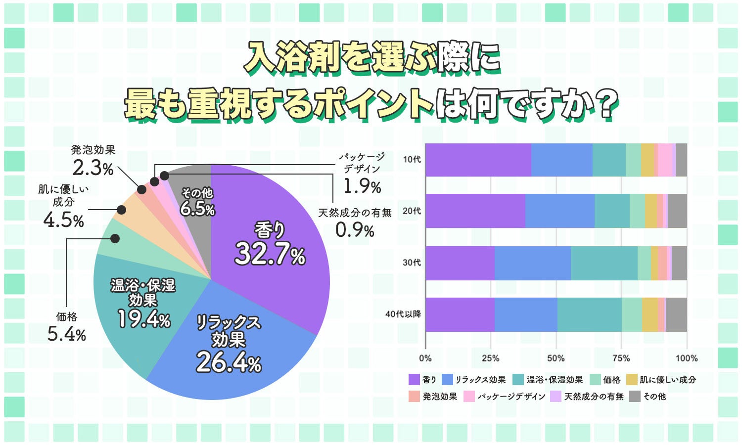 入浴剤を選ぶ際に最も重視されるポイントは「香り」であり、全体の32.7%を占めています。次いで「リラックス効果」が26.4%と高く、これらの要素が入浴体験を豊かにする重要な要因となっていることがわかります。10代・20代では「香り」を重視する層が40%ほどになっています。香りによる癒やしやリラックスを求める層が多いことが伺えます。 30代以降では「温浴・保温効果」を20%以上が重要視しており、冷え性対策などの実利的な効果も期待していることがわかる結果となっています。