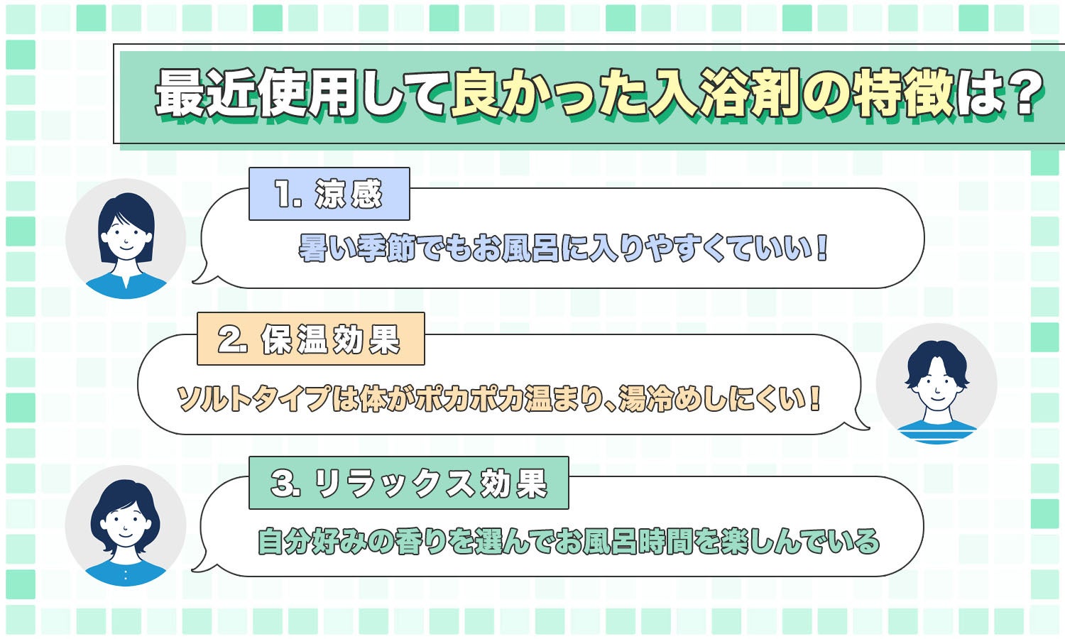 といったコメントもあり、ユーザーが入浴剤に求める特徴として、「涼感」や「保温」、「リラックス効果」などが挙げられます。季節に応じた使用感が重要視されており、暑い季節には涼感が得られる入浴剤、寒い季節には体を温める入浴剤が好まれる傾向があります。