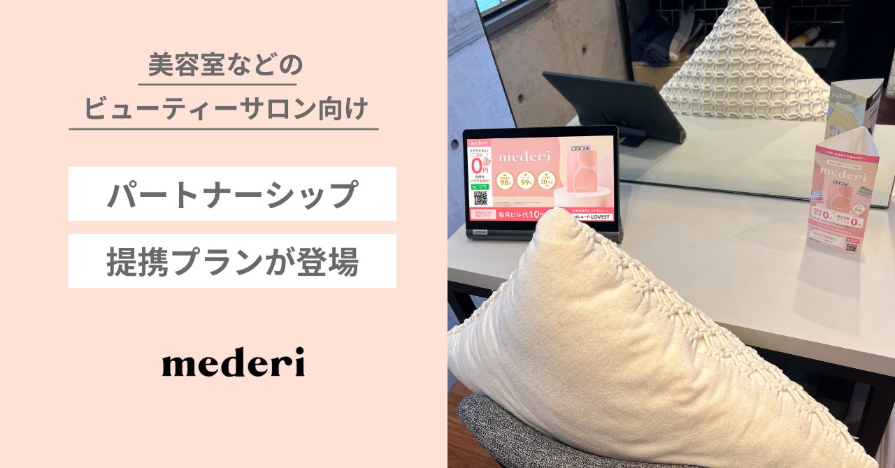 この度、美容室などのビューティーサロンを対象に『mederiパートナーシップ提携プラン』を提供し、POP設置やサイネージ掲出などを通じて店舗スタッフが顧客それぞれにマッチするmederiのサービスブランドをご案内する、送客連携を開始します。これに先立ち、rcid groupおよびLOVESTグループにて導入される運びとなり、美容室とその顧客のみなさまの双方にとって新たな価値をお届けしています。