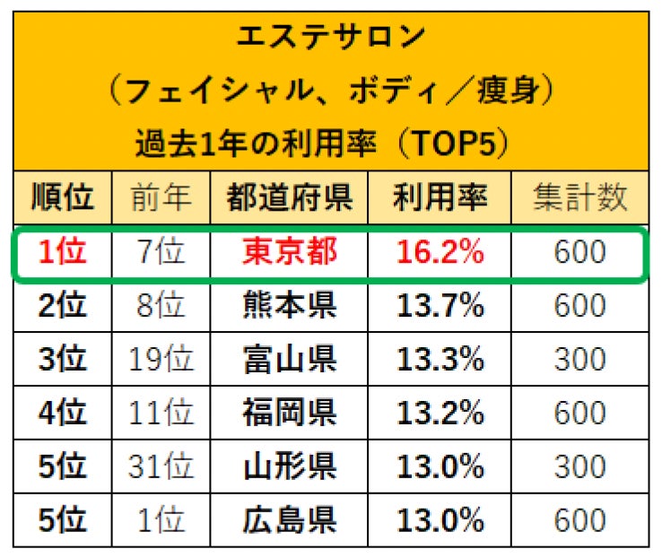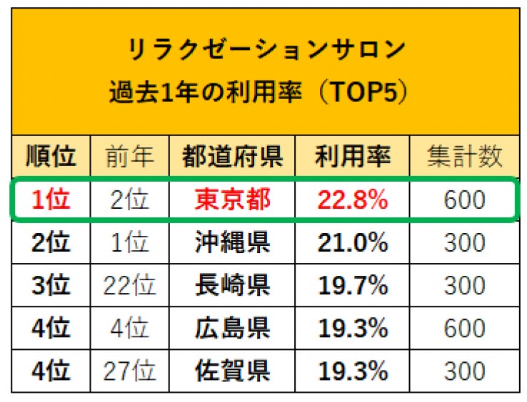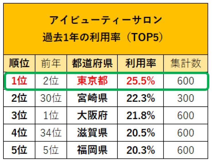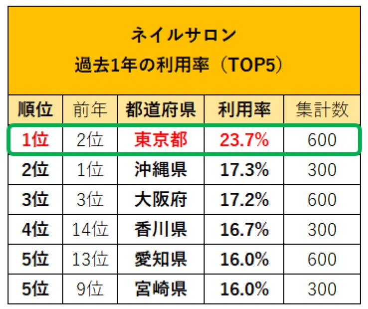 ネイルサロン、エステサロン(フェイシャル、ボディ/痩身)、リラクゼーションサロン、アイビューティーサロンの全てにおいて利用率の1位は東京都に!