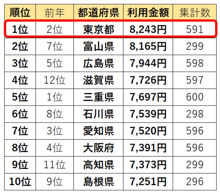 美容サロン3カ月あたりの平均利用金額1位は、東京都が前年2位からランクアップ。