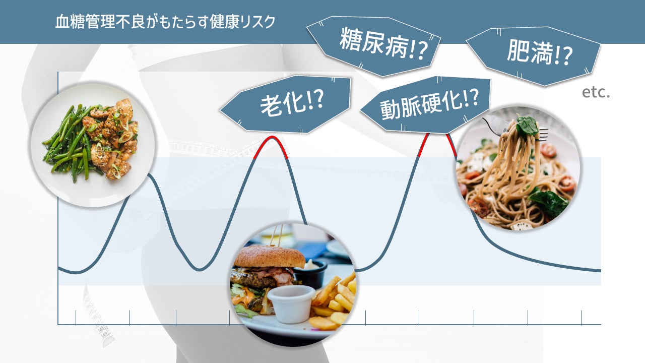 ※血糖値スパイクとは普段の血糖値は正常なのにもかかわらず、食後に限って血糖値が急上昇、急降下する現象のこと。普段正常な人でも、食べ合わせや食べ方など、様々な要因で起こりうる症状です。