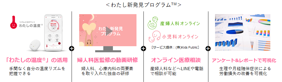 「わたし新発見プログラム™」は、寝ている間に女性特有の高温期/低温期のリズムを計測し、スマートフォンアプリと自動連携することで測定データや周期予測などが簡単に把握できるヘルスケアIoTサービス「わたしの温度®」(※1)に、婦人科領域の正しい知識を伝えパフォーマンス向上を支援する「行動変容研修」と、産婦人科、小児科に特化した「オンライン医療相談サービス」を組み合わせ、社員の健康支援に取り組む企業向けに提供するサービスです。