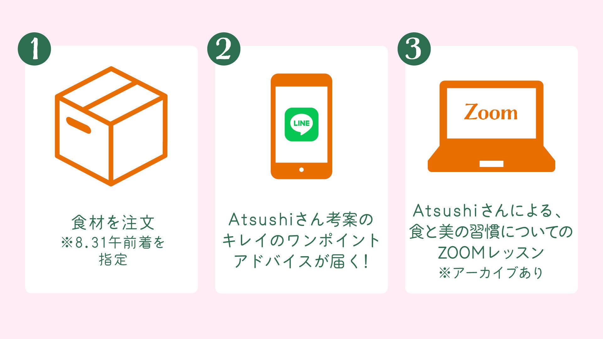 イベント中は、毎日LINEオープンチャットを通して講師のATSUSHIさんからレシピと美意識を高めるキレイのワンポイントアドバイスが届きます。