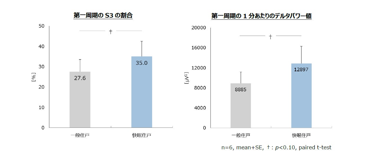 睡眠への課題感を感じている被験者において、最高の睡眠環境を構築した「快眠のための家」の方が一晩の睡眠の中で最も重要な入眠直後に約90分持続するノンレム睡眠、すなわち「黄金の90分の睡眠」が深くなり睡眠の質が向上する傾向が示唆されました。
