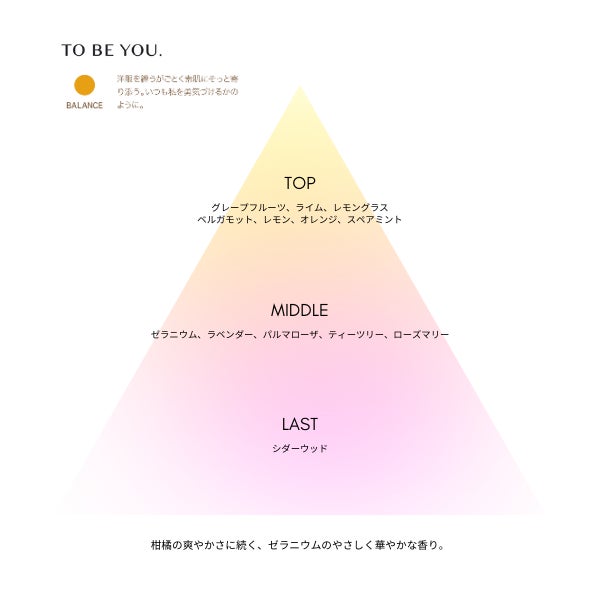 天然香料を65%配合し、心地よくやわらかな香りの広がりを叶え ながらも、しっかりと香りが持続します。 いつでもどんなときでも、“わたしらしく”いられる、そんな居心地を纏えるように。一人ひとりのアイデンティティに寄り添い、 魅力を引き出すフレグランスです。
