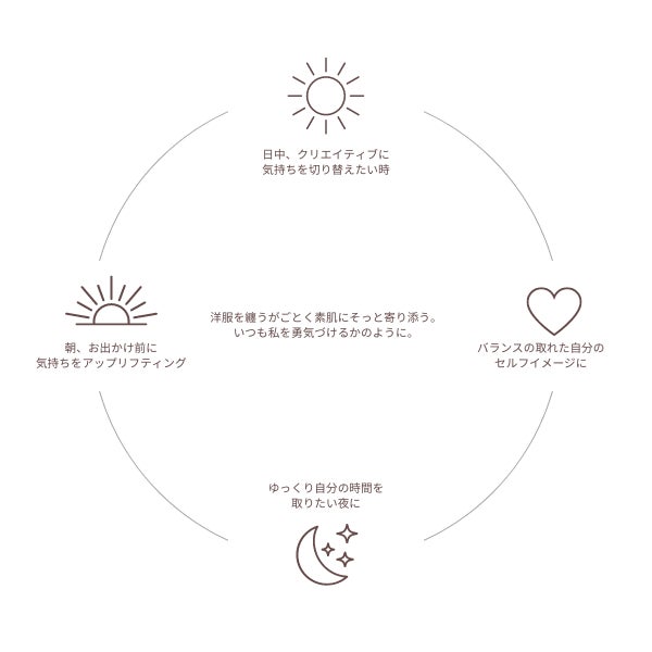 香りの継続時間は2時間ほどなので、1日に数回つけることを推奨しています。つけるたびに、 香りだけでなくうるおいも纏う気持ちでご使用いただけます。 1日全体を通して、あなたに寄り添えるフレグランスでありますように。