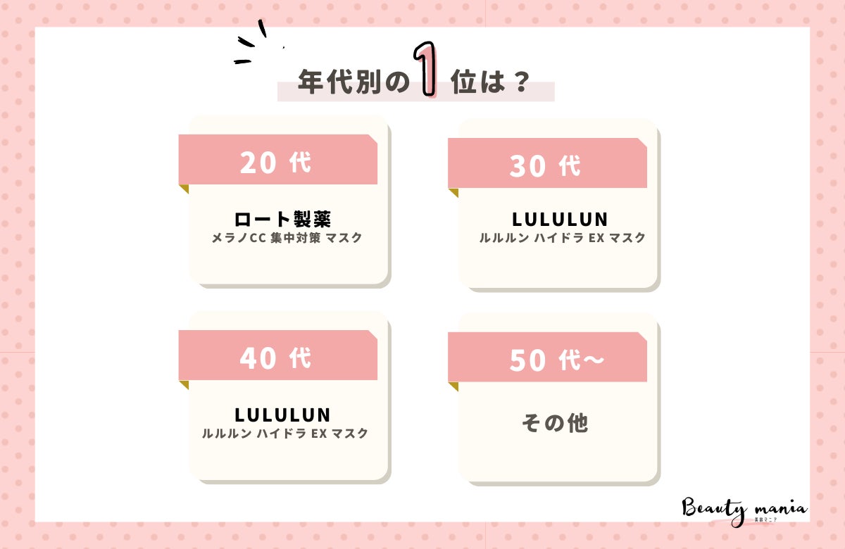 また、ロート製薬の「メラノCC 集中対策 マスク」も多くの支持を集め、特に20代から手頃な価格ドラッグストアでの買いやすさが人気でした。