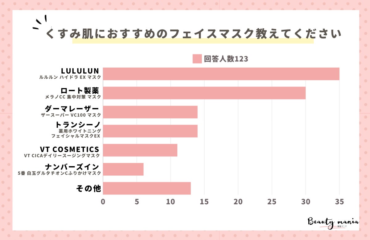 「くすみ肌におすすめのフェイスマスク教えてください」とアンケート調査した結果、1位は『LuLuLun |ルルルン ハイドラ EX マスク(35人)』、2位は『ロート製薬 | メラノCC 集中対策 マスク(30人)』、3位は『ダーマレーザー | ザースーパー VC100 マスク(14人)』となっています。