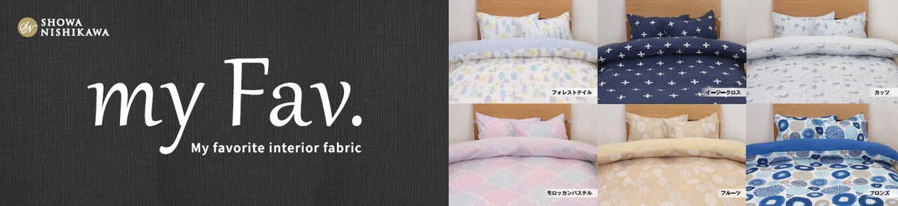 シンプルながら、色使いや柄に遊び心が散りばめたデザインにこだわった「my fav」シリーズ。掛布団カバー・敷布団カバー(シングルロングサイズ)各¥2,178円(税込)枕カバー¥657円(税込)のリーズナブルなお値段でご用意いたしました。