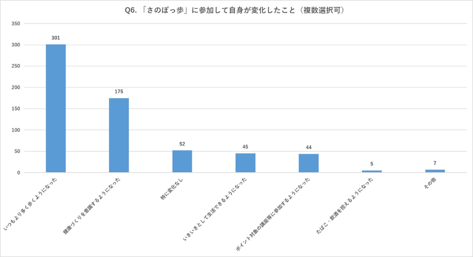 参加して自身が変化したこととして、「いつもより多く歩くようになった」「健康づくりを意識するようになった」が多く、さのぽっ歩への参加が健康面でも効果を出していると言えます。また、「数値に現れたり、記録が残るので、自然にやりがいを感じるようになった」「血圧、体重を毎日測るようになった」という意見もありました。