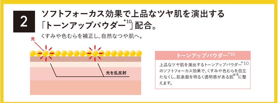 *1超高圧加工処理装置を用いた原料 *2角質層まで *3超高圧処理したテトラヘキシルデカン酸アスコルビル(保湿成分)*4メイクアップ効果による *5気になる部分へ集中的に使用 *6敏感肌の方によるパッチテスト済み(すべての方に皮膚刺激が起こらないというわけではありません) *7紫外線吸収剤無配合 *8酸化亜鉛、酸化チタン(紫外線散乱剤) *9セルロース(保湿成分) *10マイカ、酸化チタン(光沢剤) *11肌にうるおいを与え、乾燥により目立った毛穴を目立たなくすること *12乾燥してキメが乱れた肌 *13保湿成分 *14ポリクオタニウム-51(保湿成分)