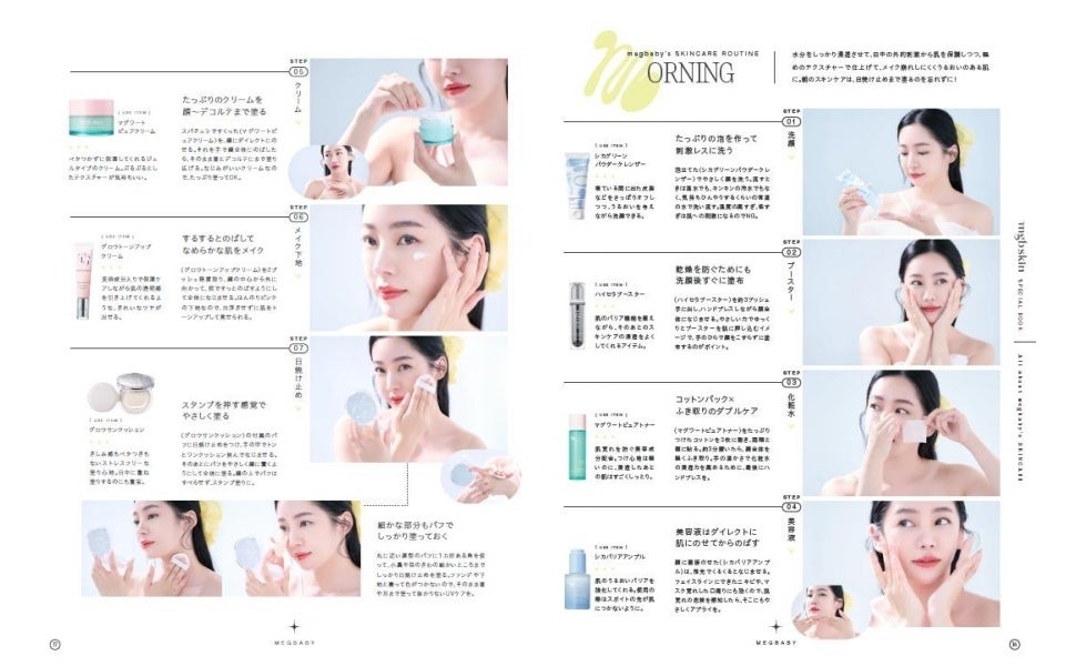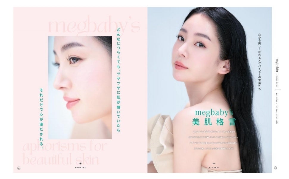 本誌では、〈mgb skin〉のブランド説明や商品の紹介、megbabyが美肌を取り入れるまでの歩み、愛用品や普段通っているサロン情報の公開等、美容情報が詰まった1冊です。