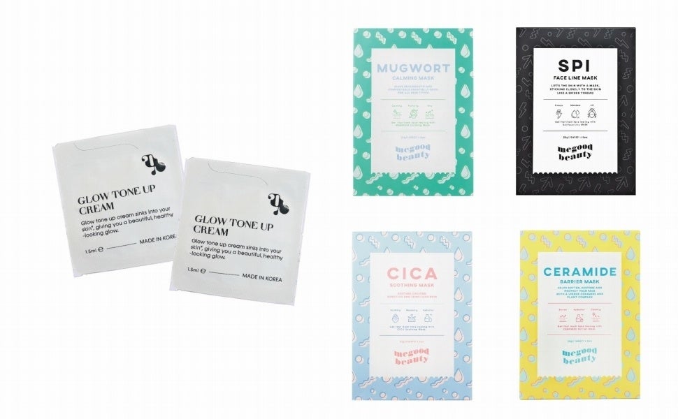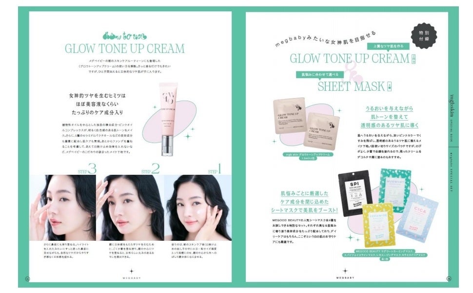 特別付録は、肌のお悩みにあわせて使えるシートマスクと4種と、今年リニューアルしたグロウトーンアップクリームのサンプル2回分が付いた「megbaby SPECIAL SET」。