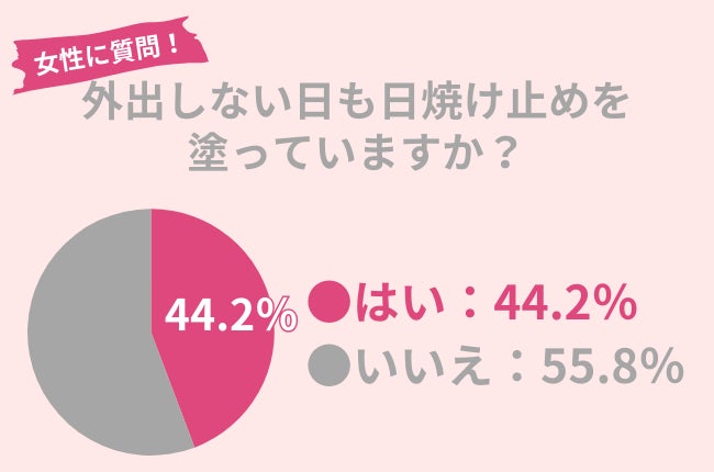 調査の結果、半分以上の女性(55.8%)が外出しない日は日焼け止めを塗らないことが明らかになりました。室内だから大丈夫と油断してはいけません。特に夏は室内でも日焼け止めを塗りましょう。紫外線が窓ガラスを通り越してしまうためです。