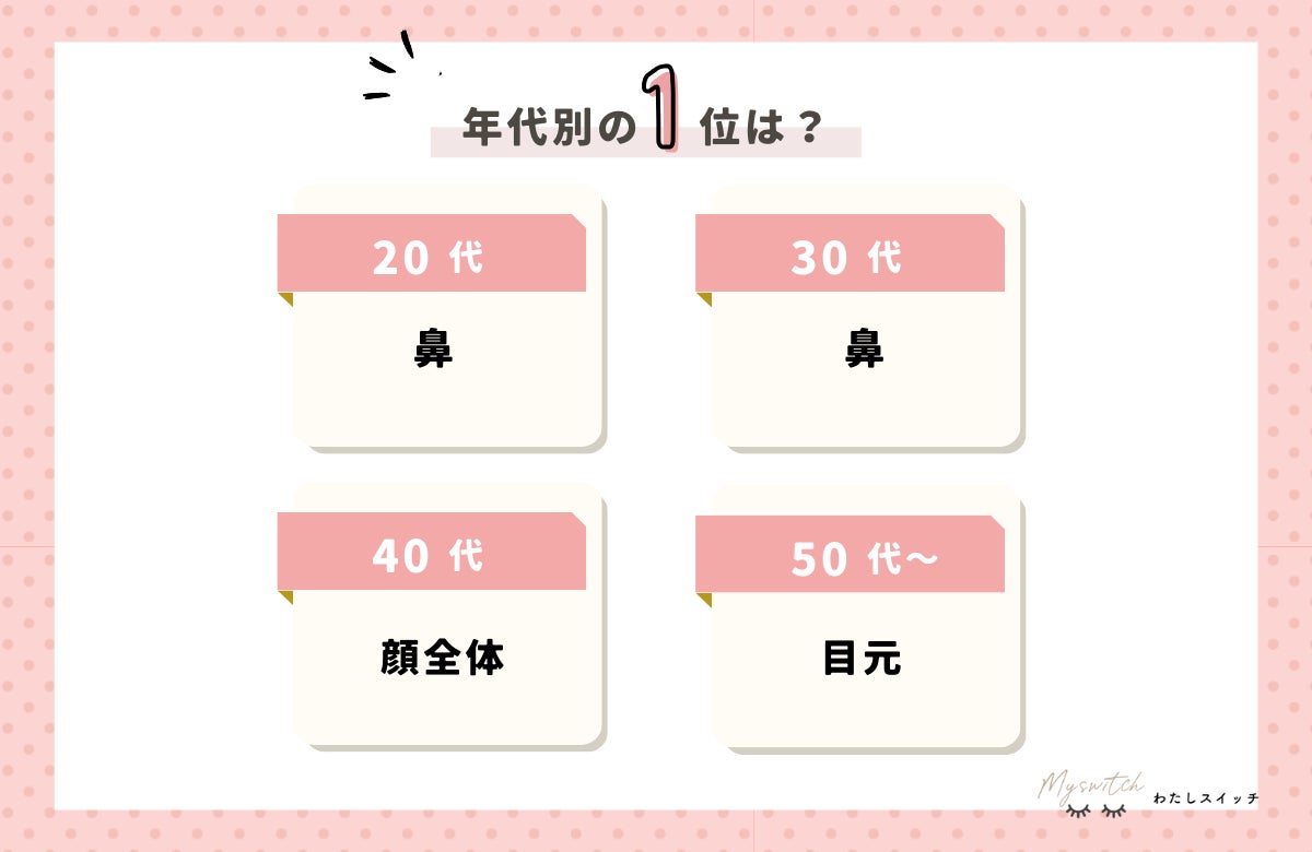 また、20代と30代では「鼻」の毛穴の黒ずみやテカリが悩みの中心となっています。