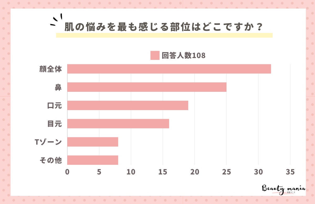 「肌の悩みを最も感じる部位はどこですか?」とアンケート調査した結果、1位は『顔全体(32人)』、2位は『鼻(25人)』、3位は『口元(19人)』でした。
