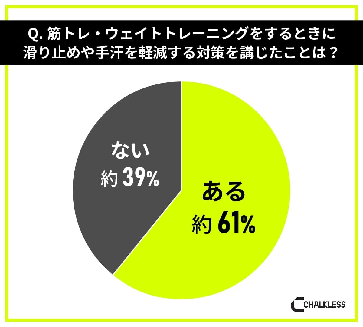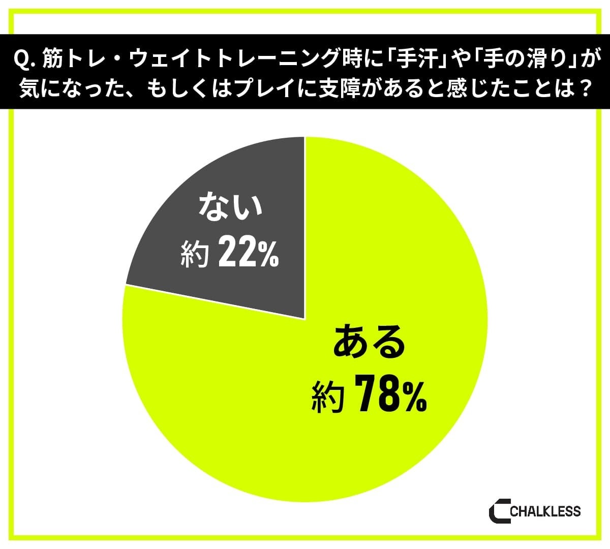 「手汗や手の滑りが気になった、もしくはプレイに支障があると感じたことがある」と回答した人は約78%、「感じたことはない」と回答した人は約22%、筋トレ・ウェイトトレーニング中の手汗や手の滑りを課題と感じている人は約78%でした。