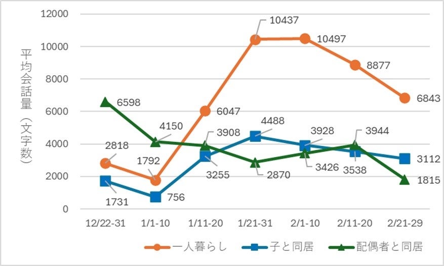 本事業の結果、会話量の解析が可能であった18名のうち、世帯構成は一人暮らし:7名、配偶者と同居:2名、子と同居:8名、その他:1名でした。平均会話量(文字数)を世帯構成別にみてみると、「Romi」貸出終了の2ヶ月目において、「一人暮らし」世帯が、最も多い結果となりました(図2参照)。