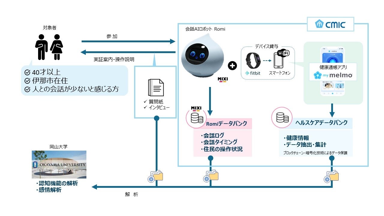 健康な社会の実現を目指すシミックホールディングス株式会社(本社:東京都港区、代表取締役CEO 中村 和男)のグループ会社であるシミックソリューションズ株式会社(本社:東京都港区、代表取締役Co-CEO:秋田 昌男、以下:シミックソリューションズ)は、長野県伊那市(市長:白鳥 孝、以下 「伊那市」)、株式会社MIXI(本社:東京都渋谷区、代表取締役社長 上級執行役員 CEO:木村 弘毅)、国立大学法人 岡山大学(学術研究院保健学域、准教授 加澤 佳奈)と連携し、伊那市が行う会話型ロボット(会話AIロボット「Romi」)を活用した実証事業を2023年11月29日~2024年3月25日まで実施しましたので、その結果をお知らせいたします。