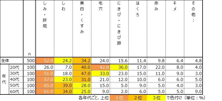 ・30代以降は、「しみ」「くすみ」など肌の色調を改善する目的が多く