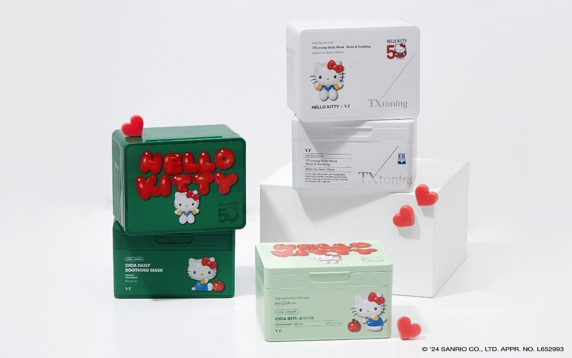 サンリオの人気キャラクターとVTの人気商品のスペシャルコラボレーションが実現!VTの人気商品である「リードルショット」からVT今期の注目商品「TXトーニング デイリーマスク」まで、複数の商品とコラボレーションし、限定版として登場します。使うたびに気分ときめくPOPなデザインで毎日のスキンケア時間を特別なものに!