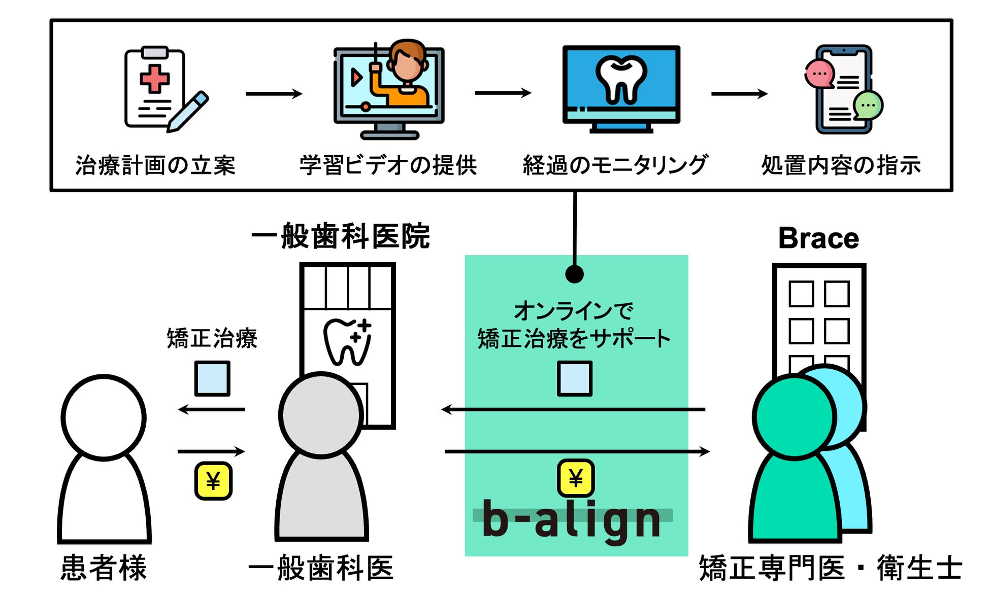 Braceは「テクノロジーで正しい歯列矯正をより多くの人へ」を掲げ、テクノロジーの力で、適切な矯正歯科医療が行き届かない地域や人々に対して、より良い治療体験を提供し続けることを目指しています。一般歯科医に対しては、矯正歯科医がオンラインで治療をサポートする「b-ortho(ビーオルソ)」を展開しており、矯正歯科専門医に対しては、プラクティスマネジメントソフトウェアの「b-align(ビーアライン)」をSaaSとして提供しています。