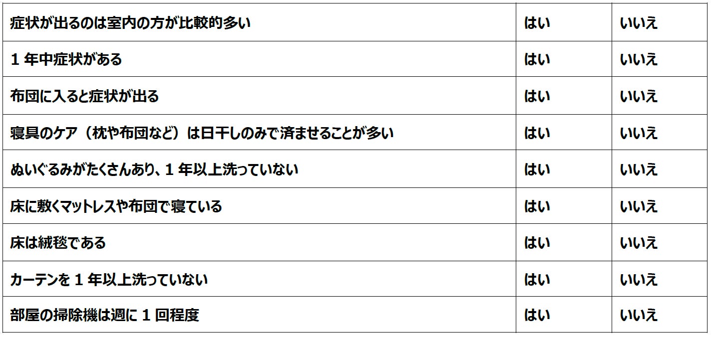 「はい」に◯が3つ以上ついた人はダニアレルギーの可能性も。