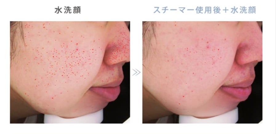 *3 男女10名の社内モニターに対して、半顔に水洗顔した時に目立つ黒ずみ毛穴の数と、半顔にピュアブライトスチーマーのHOT STEAMモードを12分使用し、水洗顔した時に目立つ黒ずみ毛穴の数を比較した平均(自社測定)。ピュアブライトスチーマー使用前を100%として比較。