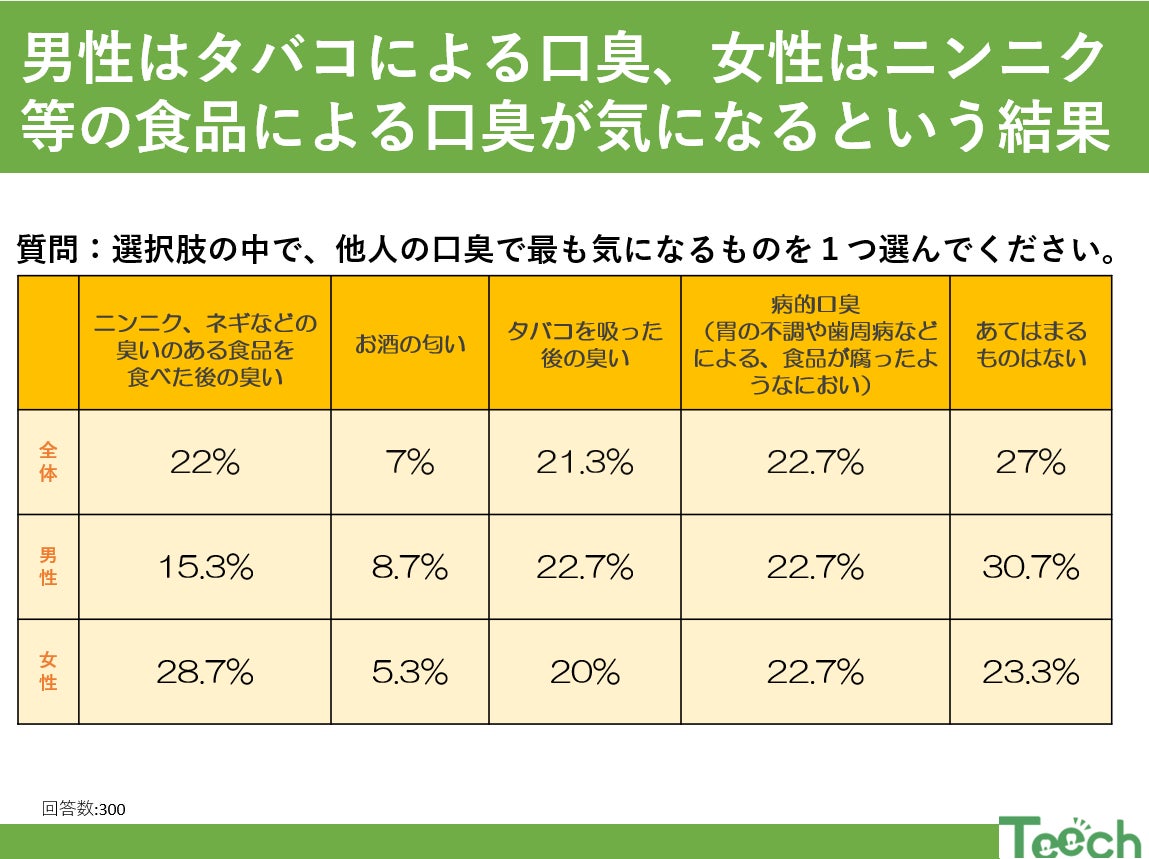 今回20代から40代の男女を対象に「他人の口臭で最も気になるものは?」というアンケートを実施したところ、いくつか興味深い結果が得られました。この結果をもとに、口臭の感じ方についてさらに深掘りしていきましょう。