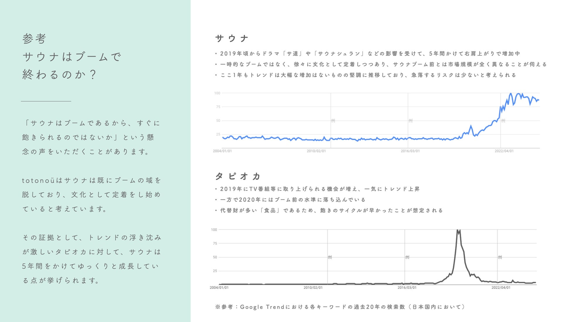 昨今「サウナはブームであるから、すぐに飽きられるのではないか」という懸念の声をいただくことがありますが、我々totonoüはサウナは既にブームの域を脱しており、文化として定着し始めていると考えています。