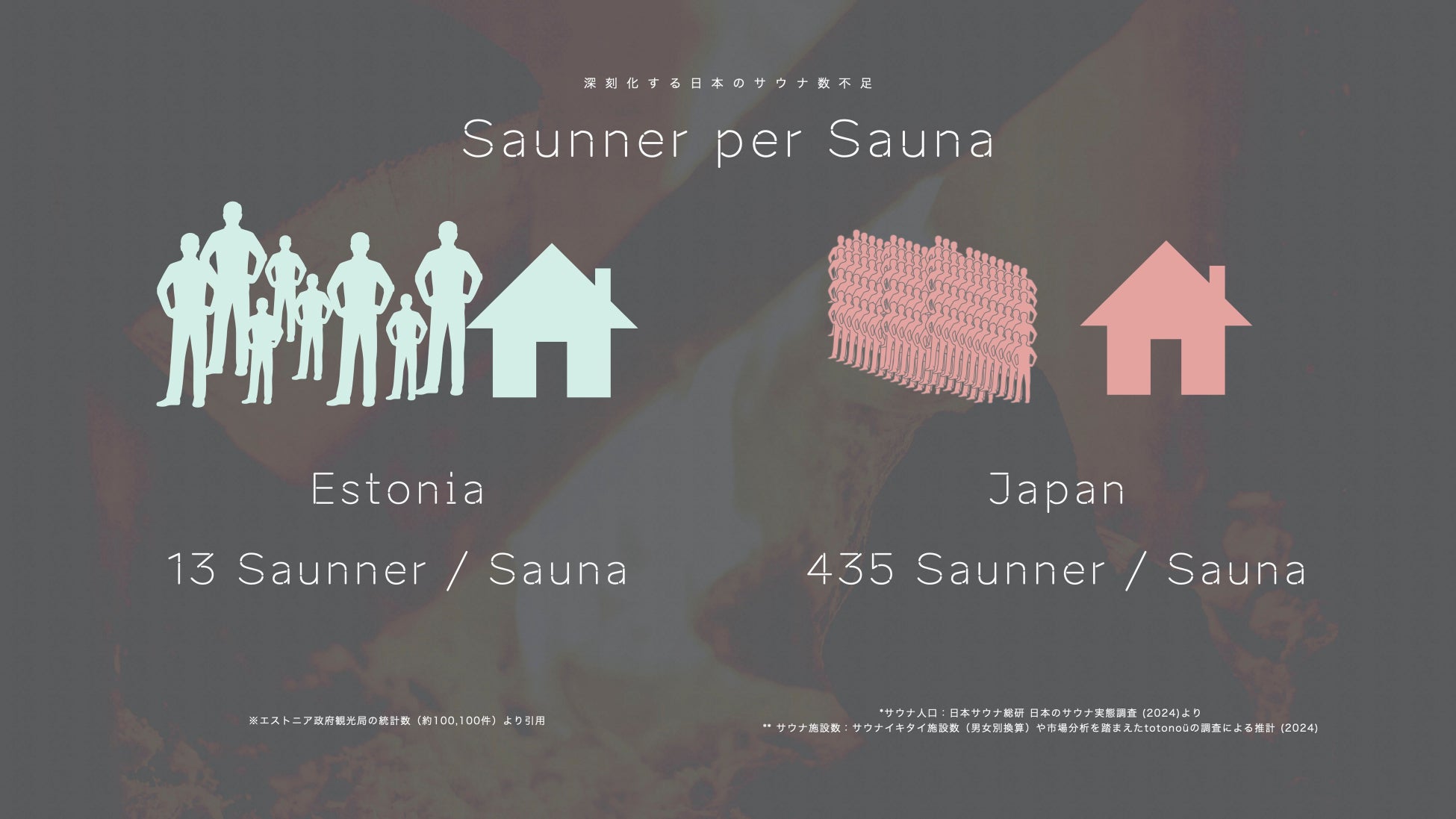 現在、日本には推定1780万人*のサウナ愛好家がいると言われています。これに対し、日本のサウナ数は推計4万件**にとどまっており、サウナ愛好家人口に対してのサウナの数、いわゆる“サウナ普及率”は北欧諸国と比べると低いのが実情です。