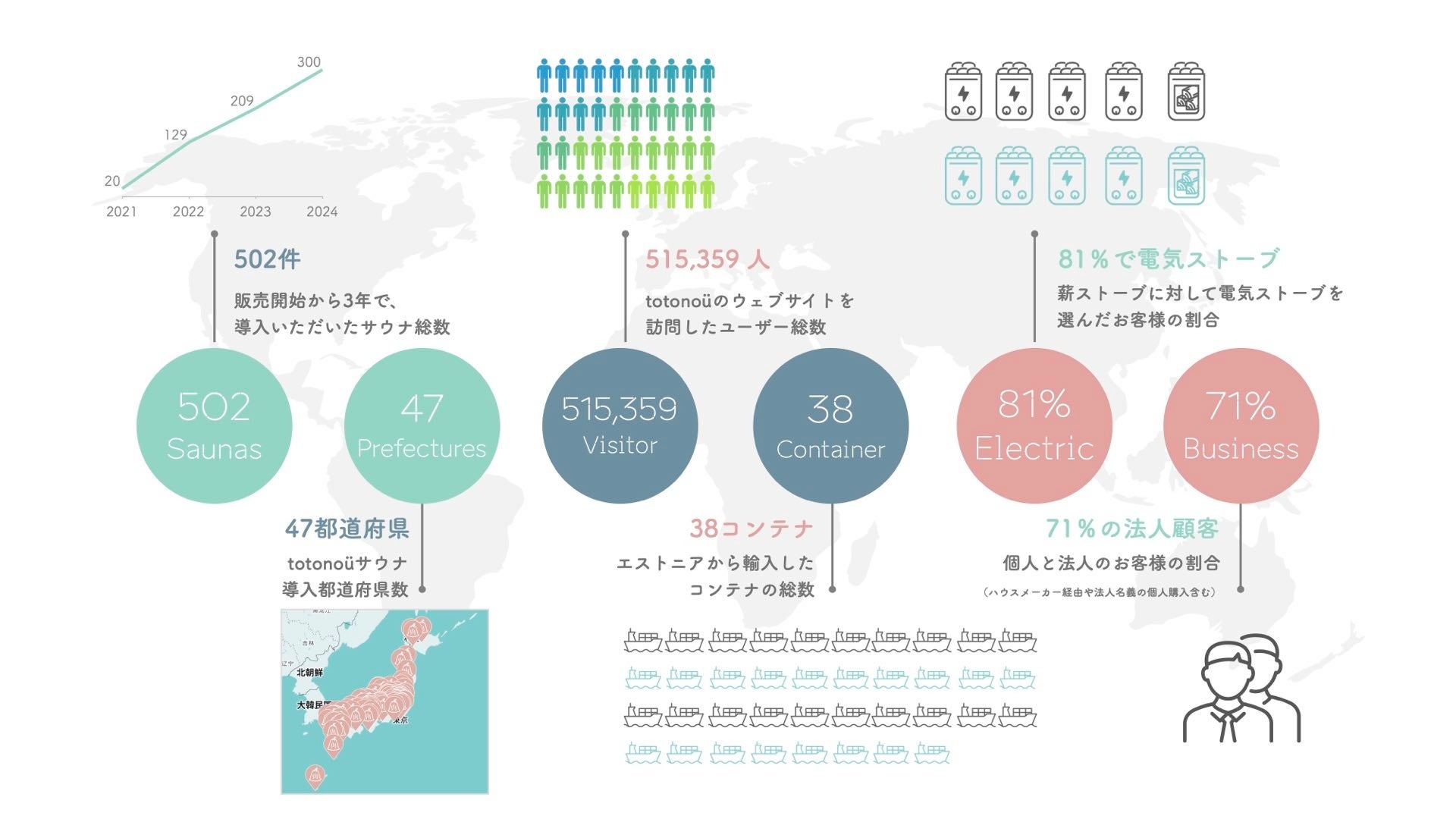 2021年の販売開始以降、年々販売台数を重ね、2024年に累計販売台数が500台を突破。また、全国47都道府県への導入も達成し、北は北海道、南は沖縄まで、日本全国でtotonoüのサウナをお愉しみいただけるようになりました。