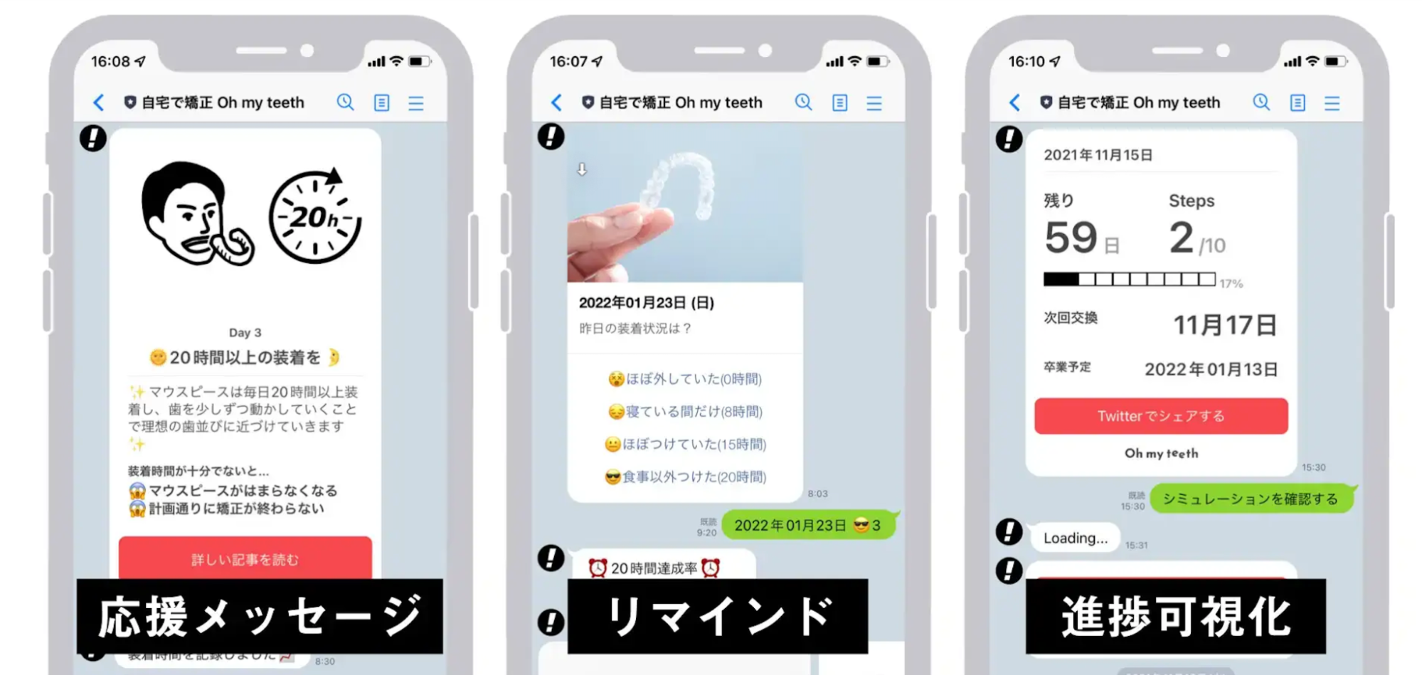 Oh my teethは次の3つの機能によってユーザーのモチベーションを維持し、矯正完走までサポートします。