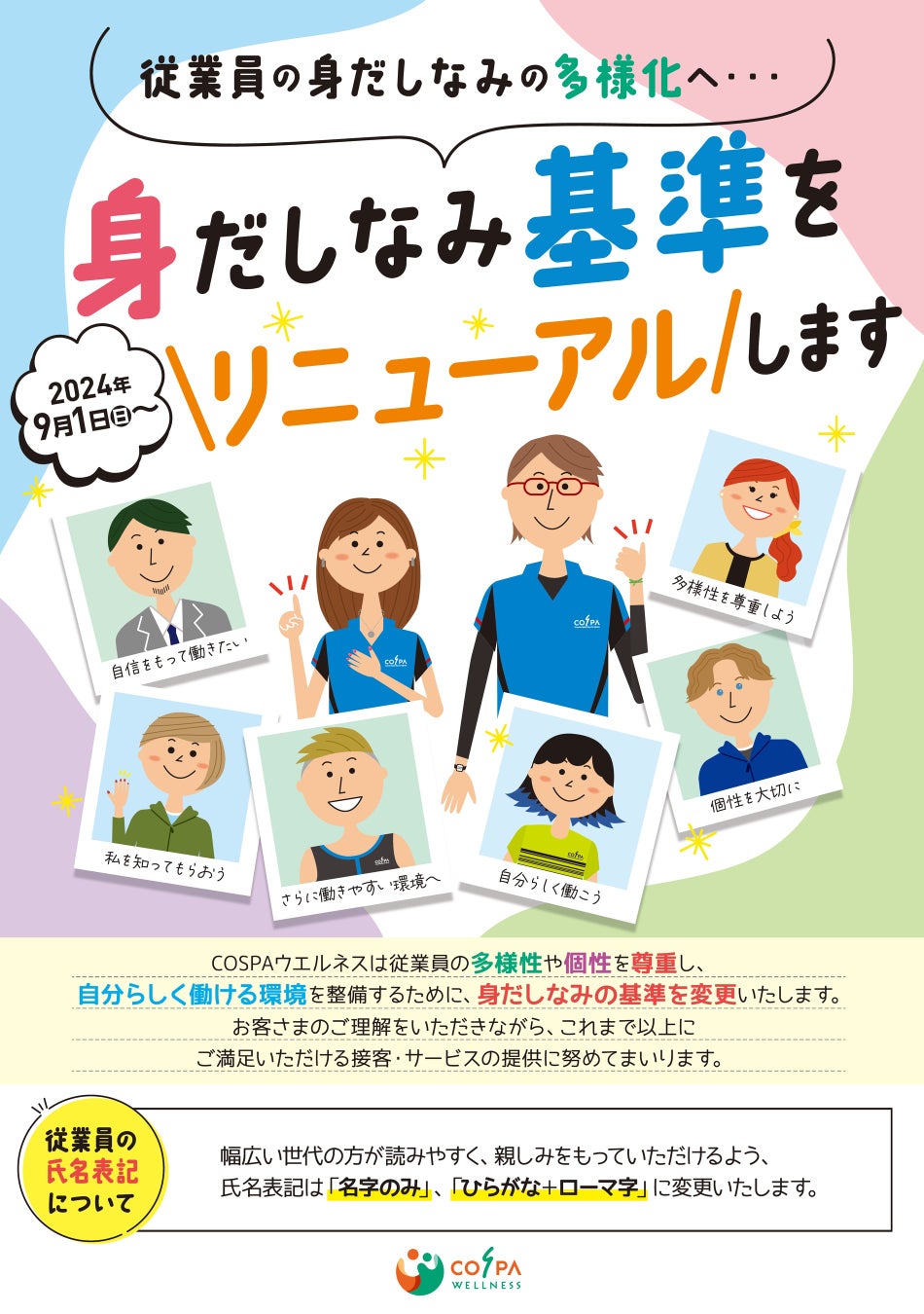 COSPAウエルネスは従業員の多様性や個性を尊重し、自分らしく働ける環境を整備するために、身だしなみの基準を変更いたします